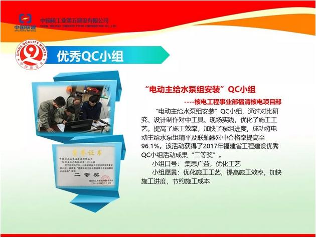 “电动主给水泵组安装”QC小组,通过对比研究、设计制作对中工具、现场实践,优化了施工工艺,提高了施工效率,加快了泵组进度,成功将电动主给水泵组精平及联轴器对中合格率提高至96.1%。该活动获得了2017年福建省工程建设优秀QC小组活动成果“二等奖”。