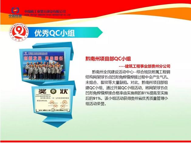黔南州全民建设活动中心--综合馆及附属工程钢结构网架球节点凹形角焊缝焊接过程中会产生气孔、未熔合、裂纹等大量缺陷。对此,黔南州项目部组建QC小组,通过开展QC小组活动,将网架球节点凹形角焊缝焊接合格率由实施前的81%提高至实施后的91%。该小组活动获得贵州省优秀质量管理小组活动荣誉。