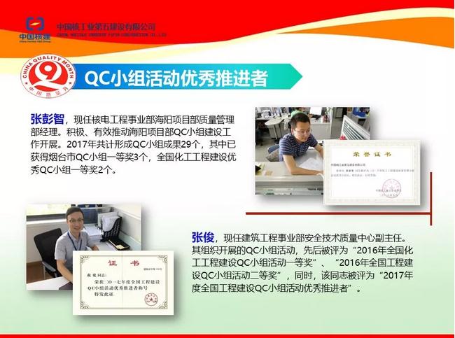 张彭智,现任核电工程事业部海阳项目部质量管理部经理。积极、有效推动海阳项目部QC小组建设工作开展。2017年共计形成QC小组成果29个,其中已获得烟台市QC小组一等奖3个,全国化工工程建设优秀QC小组一等奖2个。