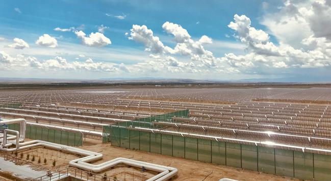 中广核德令哈光热示范项目位于青海省海西蒙古族藏族自治州德令哈市的戈壁滩上,占地2.46平方公里,相当于360多个标准足球场的面积,采用了槽式导热油集热技术路线,配套9小时熔融盐储热,由太阳岛、热传及蒸汽发生系统、储热岛、发电岛四大部分组成。
