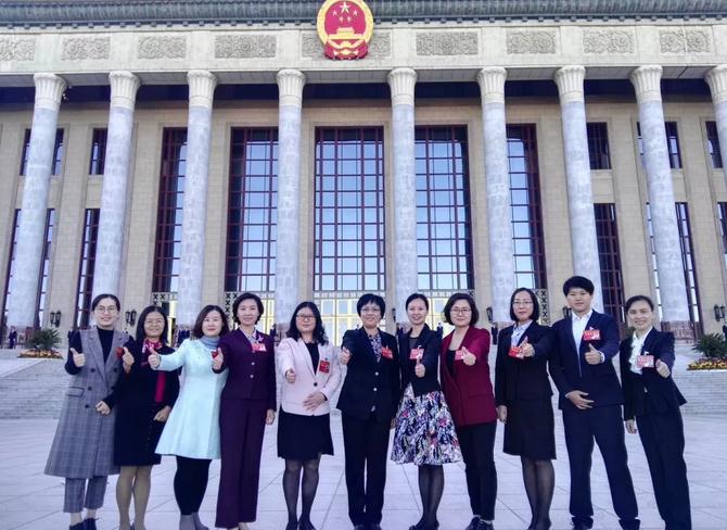 杨萌(前排左六)与参会妇女代表在人民大会堂前