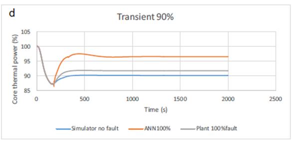 上图左边是输入电站参数,用ANN中 “误差反向传播”(back propagation) 算法,得知右边最重要的安全参数,例如堆心然料包鞘表面温度,然后与已知大数据库相关参数比对,如不一致则进入异常状况,大数据库为所有可能发生的事故分析成果,包含机件、人为、天灾等案例,预先输入此系统,让机器学习并且建立运算法则 (Algorithm)。其后步步为营,于是全盘掌控不在话下。我们已完成正常运转时发生小破管泄漏的 AI 侦测演算法,下图在降载 90%,稳压器顶端泄压阀发生泄漏,堆心热功率为了补偿热流损失自动抽棒上升,人工神经网络 ANN计算的功率比高速仿真和实际功率更大,ANN演算法明确指示并估算泄漏大小,操作员可及时采取应变措施。