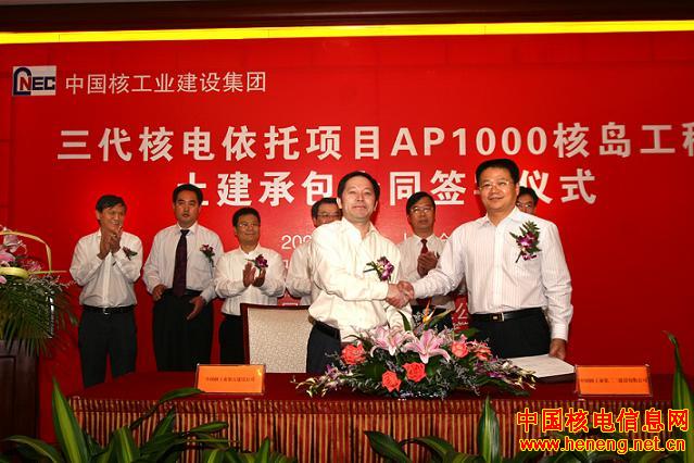 秋高气爽,风和日丽。10月18日下午,我国三代核电依托项目浙江三门、山东海阳AP1000一期核岛土建承包合同在上海签订。中国核工业第五建设公司总经理庄火林与中国核工业第二二建设有限公司董事长张献豪、中国核工业第二四建设公司总经理陈良柱分别代表双方在浙江三门AP1000一期核岛工程和山东海阳AP1000一期核岛工程土建承包合同上签字。它为AP1000核电后续建造工作的有效开展提供了更加科学、更加专业的合作基础。