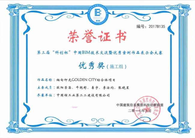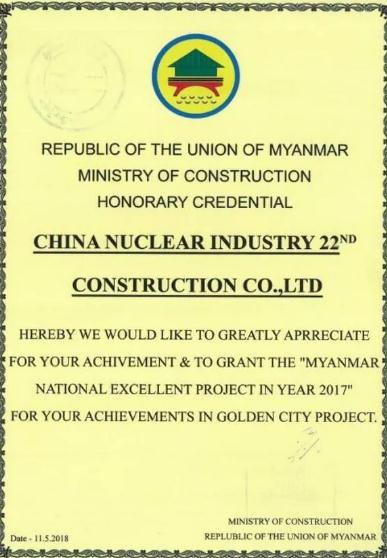 2018年5月11日,从缅甸传来喜讯,由中核二二承建的缅甸仰光GOLDEN CITY综合体项目获缅甸联邦政府建设部颁发的“2017年度缅甸国家优质工程奖”称号。据悉,该奖项尚属首次颁发给非缅甸的企业。