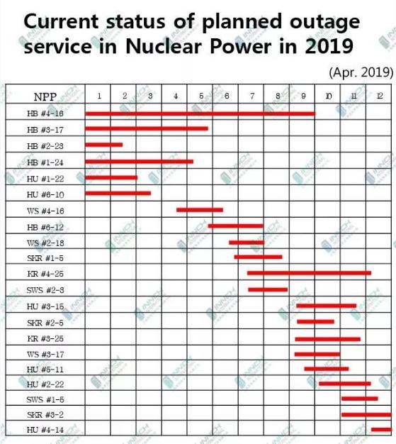 同时,小编也收集了2019年韩国核电厂运维服务安排计划表,从图中可以看到今年韩国核电有21台机组有大修计划。