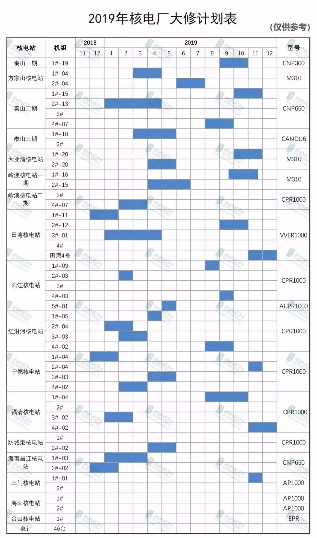 以下是近期更新过的2019年中国核电机组大修计划时间表。2019年,中国共有35台核电机组制定了大修计划,中国核电运维市场进一步扩容。涉及秦山核电、田湾核电等。
