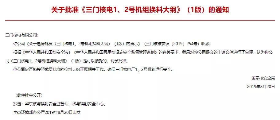 据国家核安全局最新消息,三门核电有限公司《关于恳请批复〈三门核电1、2号机组换料大纲〉(1版)的请示》(三门核核安发〔2019〕254号)已获得批准。