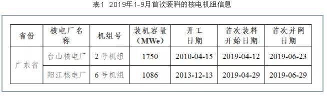 截至2019年9月30日,我国运行核电机组共47台[1](本报告不含台湾地区核电信息),装机容量为48751.16MWe(额定装机容量)。2019年1-9月全国共有2台核电机组完成首次装料,详见表1。
