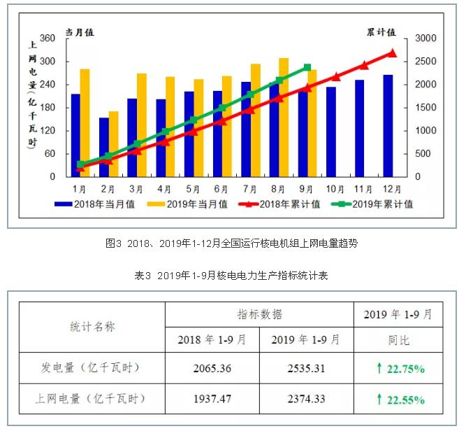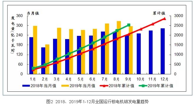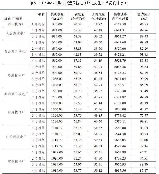 2019年1-9月,47台运行核电机组累计发电量为2535.31亿千瓦时,比2018年同期上升了22.75%;累计上网电量为2374.33亿千瓦时,比2018年同期上升了22.55%。1-9月,核电设备利用小时数[6]为5402.31小时,平均能力因子[7]为92.35%。