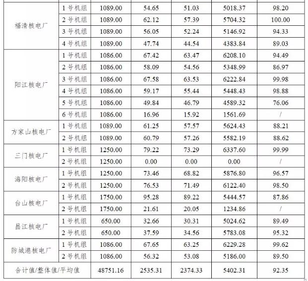 3、对于本表最后一行的“合计值/整体值/平均值”,装机容量、发电量、上网电量为各机组合计值,核电设备利用小时数为全部机组整体值,能力因子为全部机组的算数平均值。