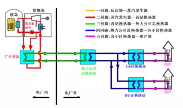 核能供热的主要原理是从核电机组二回路抽取蒸汽作为热源(此热源没有放射性),通过厂内换热首站、厂外供热企业换热站进行多级换热,经市政供热管网将热量传递至最终用户。