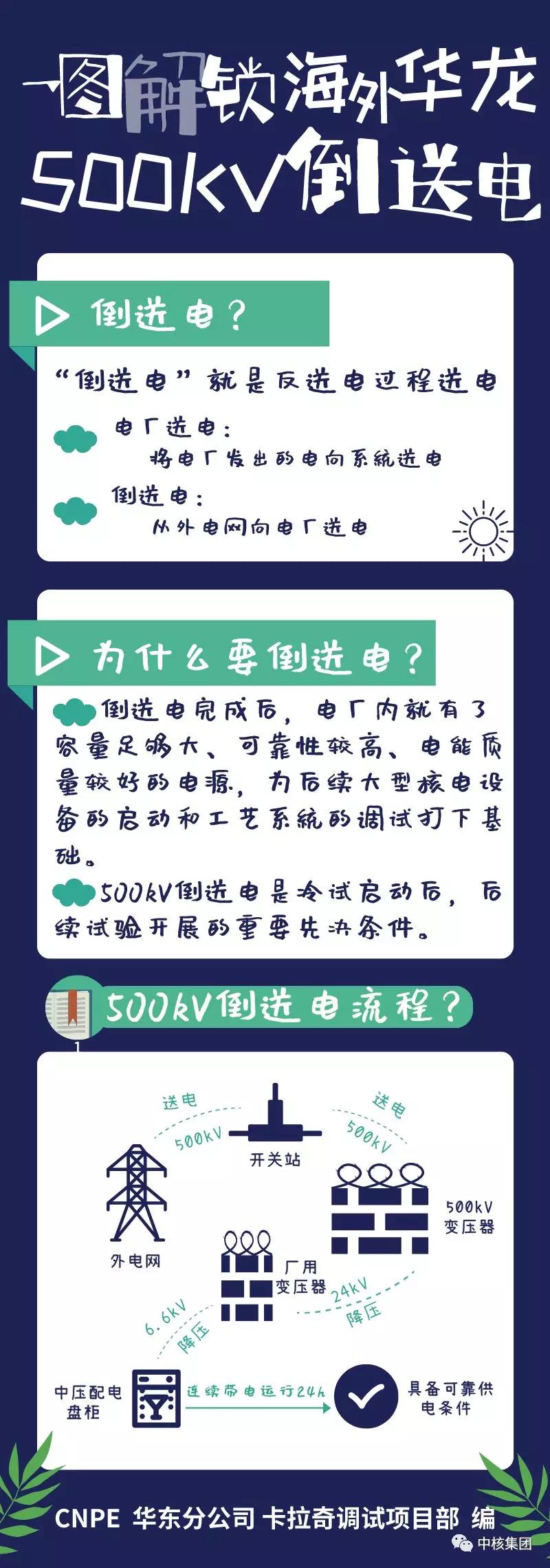500KV倒送电的成功,为华龙一号海外首堆冷试完成及后续热试、装料等工作提供了可靠的电源保证,是核电建设的重要里程碑节点。