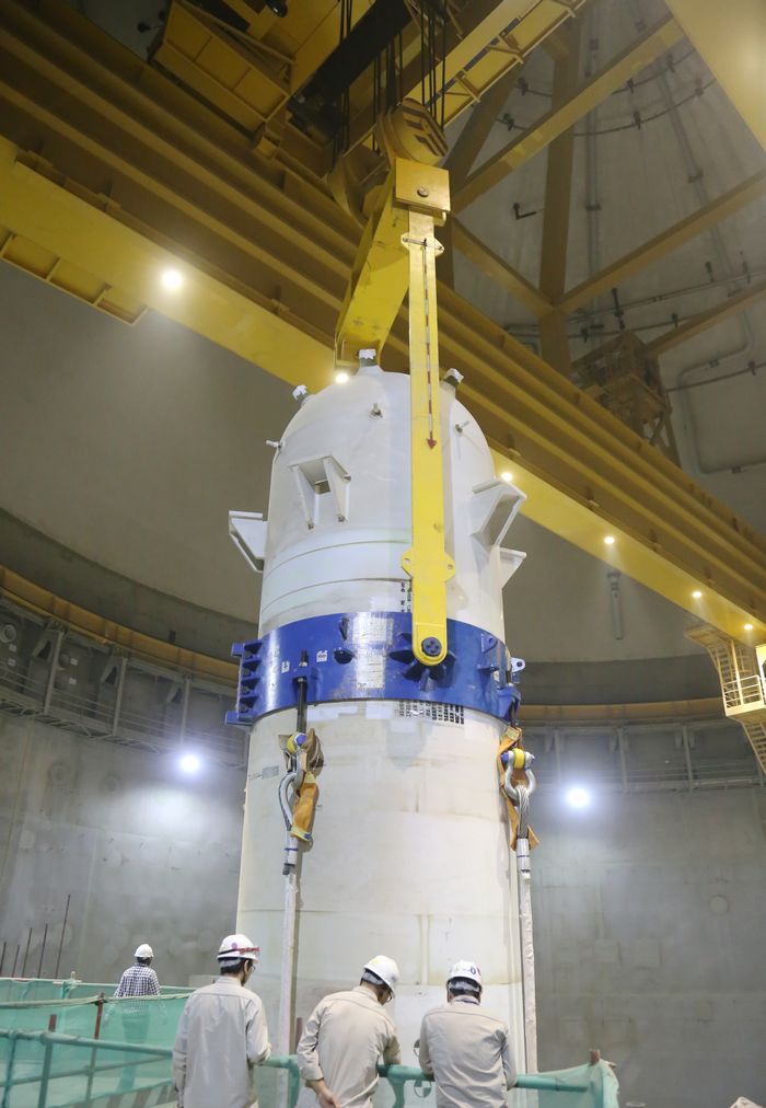 稳压器又称压力平衡器,是用来控制反应堆冷却剂系统压力变化的设备。在正常运行时,起保持压力的作用,在发生事故时,提供超压保护。因此它对整个核电站的安全稳定运行起着至关重要的作用。K3机组稳压器净重约104吨,总高度约13.8米。使用龙门架450吨吊车提升至16.5米转运平台,再通过重载车引入NB厂房16.5米大厅,由环吊完成翻转竖立并吊装至腔室就位。
