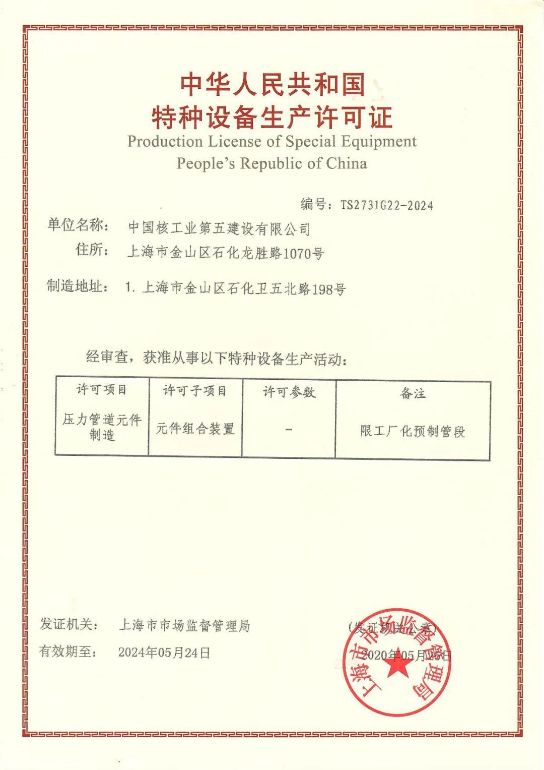 5月28日,中核五公司取得了上海市市场监督管理局颁发的《中华人民共和国特种设备生产许可证(压力管道元件制造)》,获准从事压力管道元件组合装置(限工厂化预制管段)的制造,有效期至2024年5月24日。