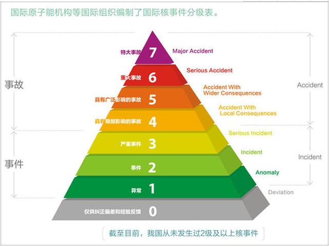 备注:国际核事件分级表(INES)1-3级为事件,4-7级为事故。0级属于偏差,不在INES表内,也不在核应急范围内,仅用于电厂纠正偏差和经验反馈。
