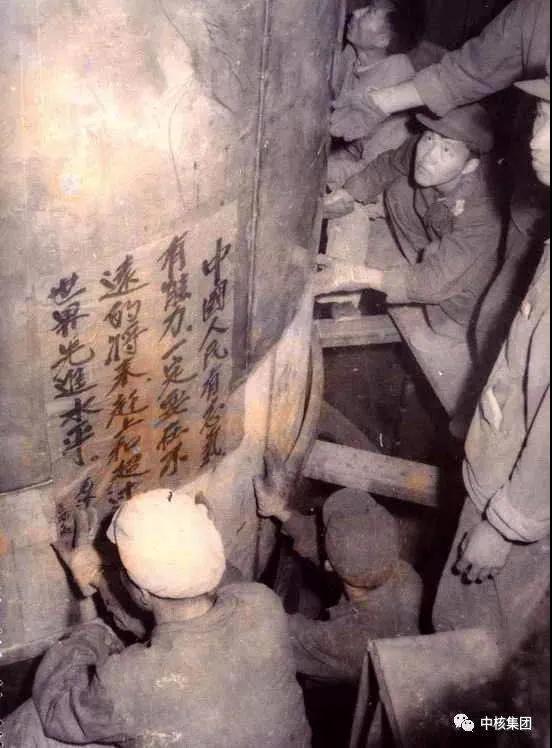 1969年,第一代核潜艇陆上模式堆的压力容器正式安装就位。容器外面贴着一幅字:“中国人民有志气、有能力,一定要在不远的将来,赶上和超过世界先进水平。”