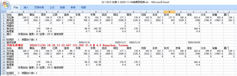11月6日北京时间2点36分台湾(22.6° 121.4°)地区发生4.9级地震。在11月5日全国MDCB法电磁波联网预报地震协作组处理4日各台站观测数据,发现东莞台站在4日临震信息表中对这个地区做出临震预报,经纬度是(22°120.5°)。纬度误差为0.6°、经度误差为0.9°。详见下表。