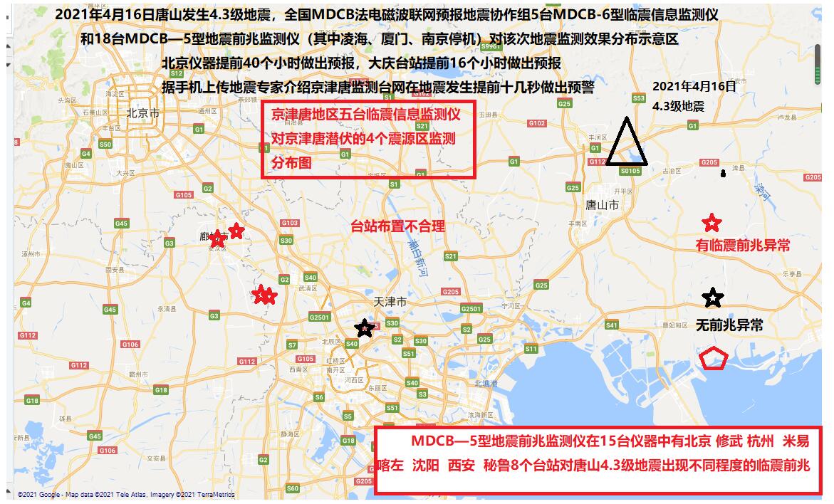 依据国家地震台网测定:2021年04月16日16时06分,在河北省唐山市滦州市发生4.3级地震(北纬39.75度,东经118.71度),震源深度9千米。地震发生后,唐山市委副书记、市长高建民,市委.......4月15日给各地震预报研究人员发送的15日计算机研究14日的3个成果文件中,在国内地区文件夹内,北京台站就监测到该地震的临震信息,在临震预报表内,北京台站预报唐山附近未来几天可能发震的经纬度是39.6度 118.2度。16日处理国内外18个台站的资料,大庆台站对该地区的震情做了同样对于保,均与16日实际发震地点误差在50公里左右,距离发震时间方面,由提前40个小时缩短到16个小时。