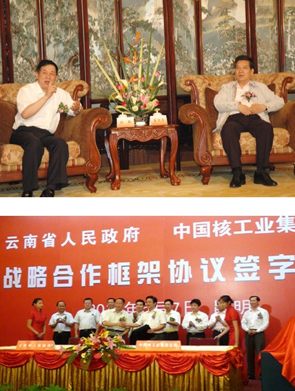 5月7日,中国核工业集团公司与云南省人民政府在昆明签署了“战略合作框架协议”,双方将在核电项目建设、铀资源开发等方面开展深入合作。中核集团公司党组书记、总经理孙勤,云南省省委副书记、省长秦光荣出席了签字仪式。中核集团公司党组成员、副总经理余剑锋,云南省省委常委、常务副省长罗正富分别代表双方在协议上签字。
